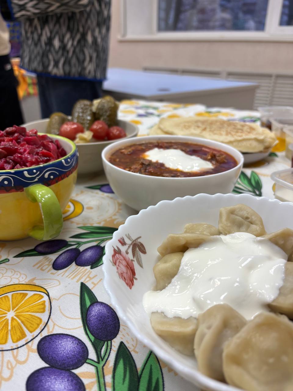 - студенты из России приготовили домашние пельмени, борщ, винегрет и торт "Медовик";