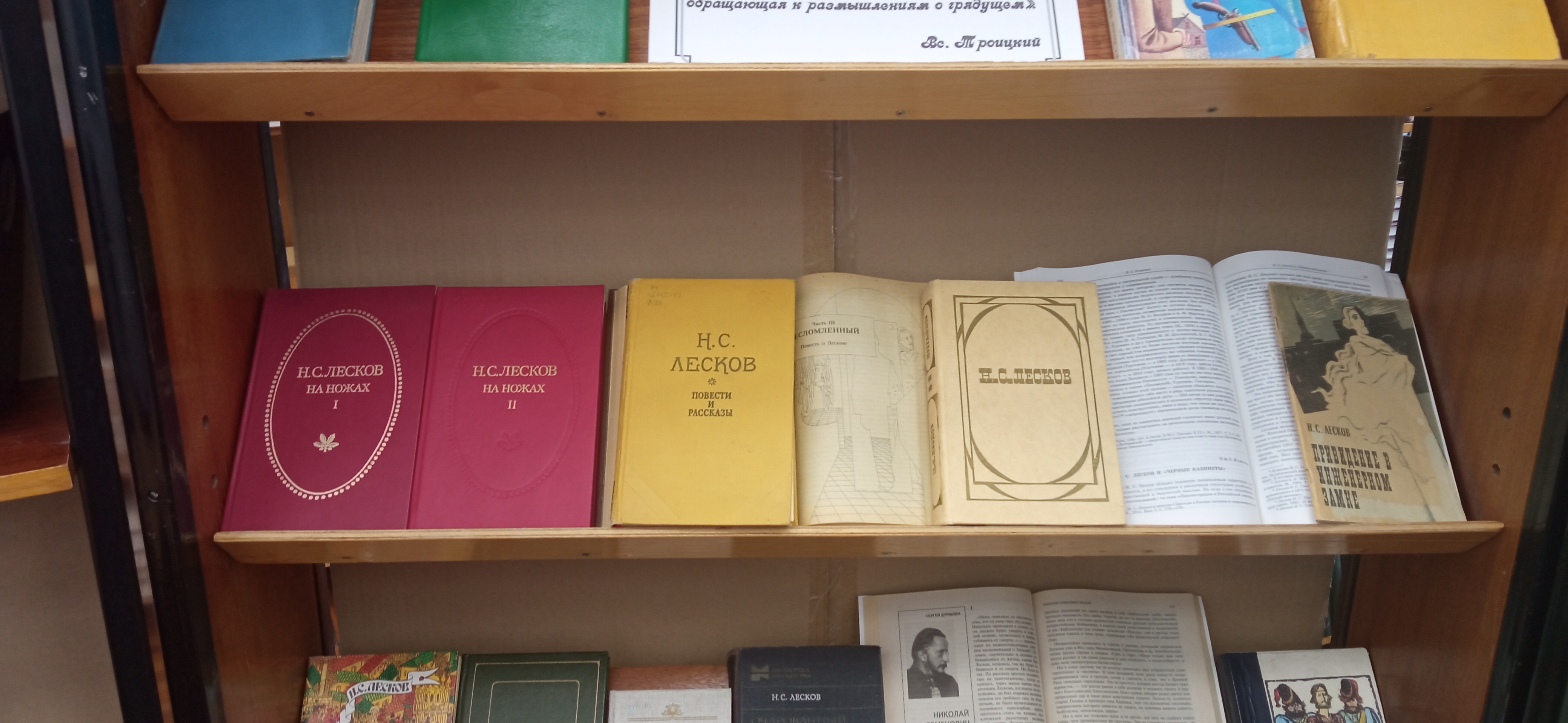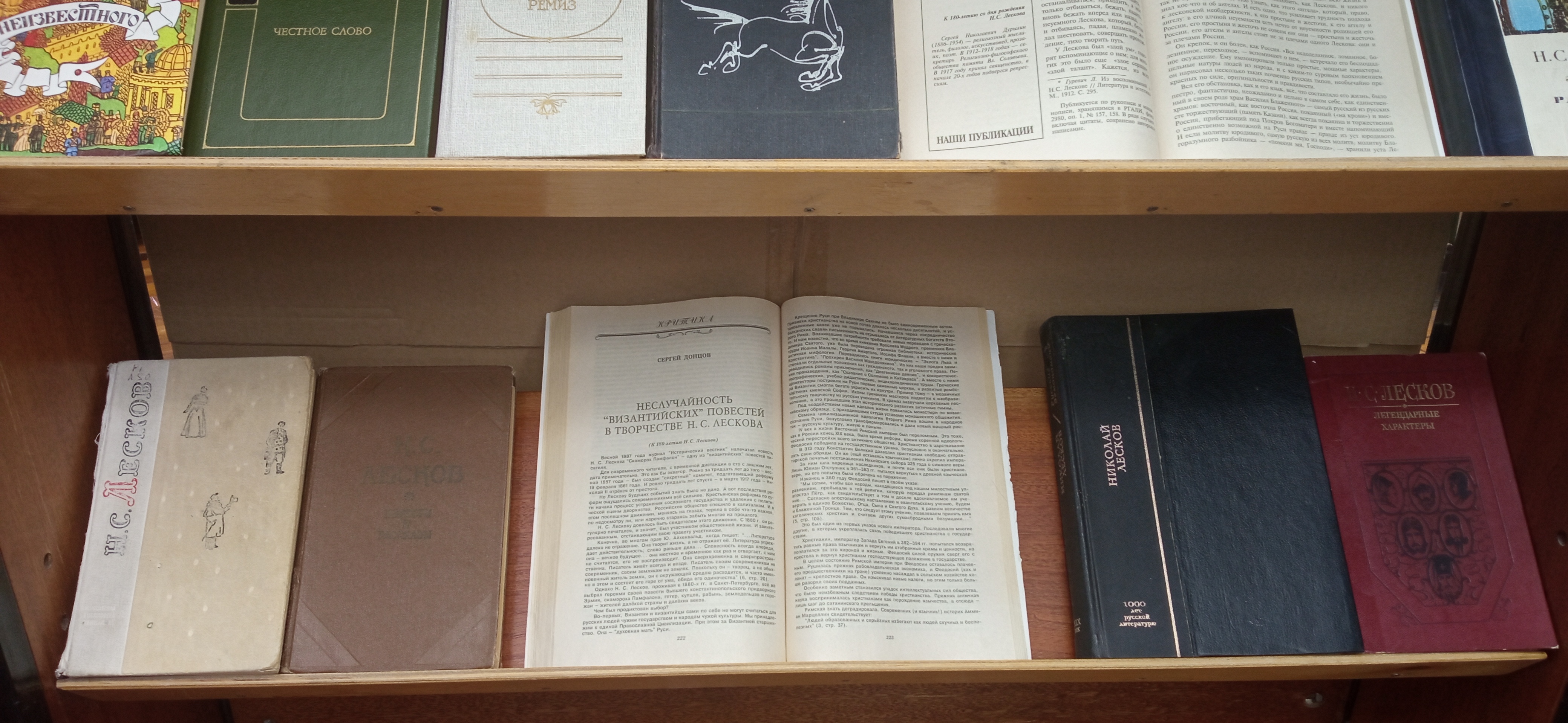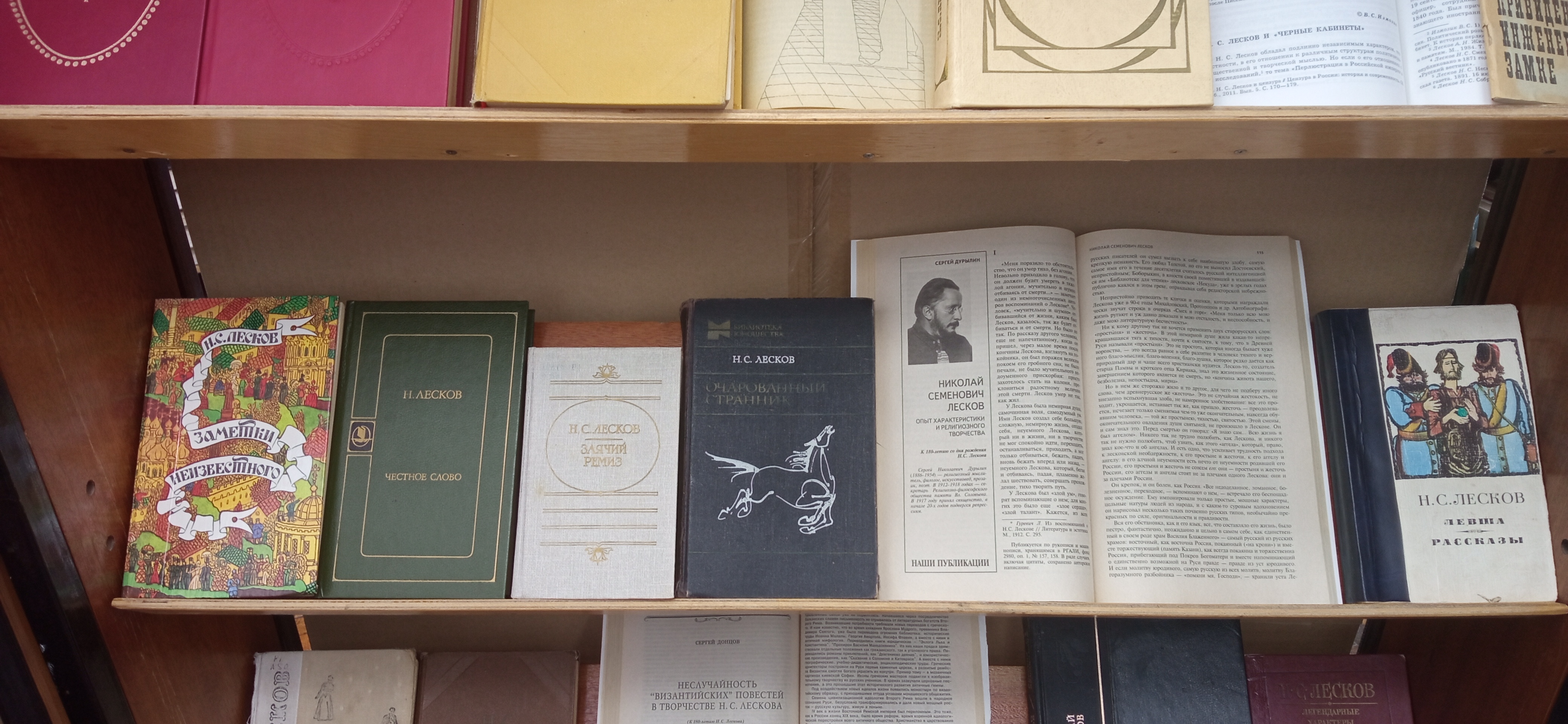 На выставке представлены знаменитые произведения Лескова «Левша», «Очарованный странник», «Леди Макбет Мценского уезда» и др., а так же литературоведческие труды о творчестве классика, биографические материалы о его жизни и деятельности.