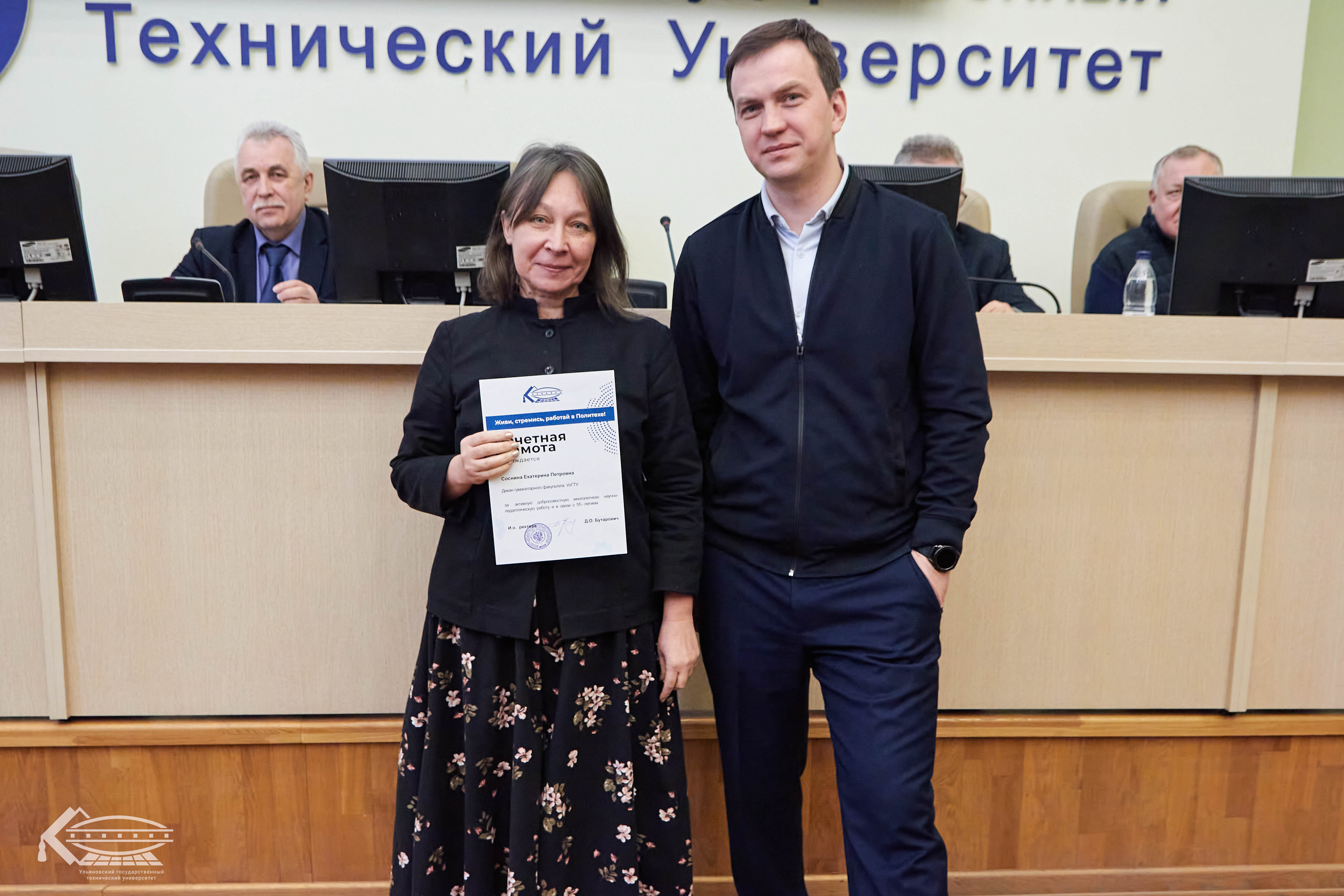 Почётной грамотой УлГТУ за многолетний добросовестный труд, высокий профессионализм и вклад в развитие университета в связи с юбилеем награждена декан гуманитарного факультета Екатерина Соснина.