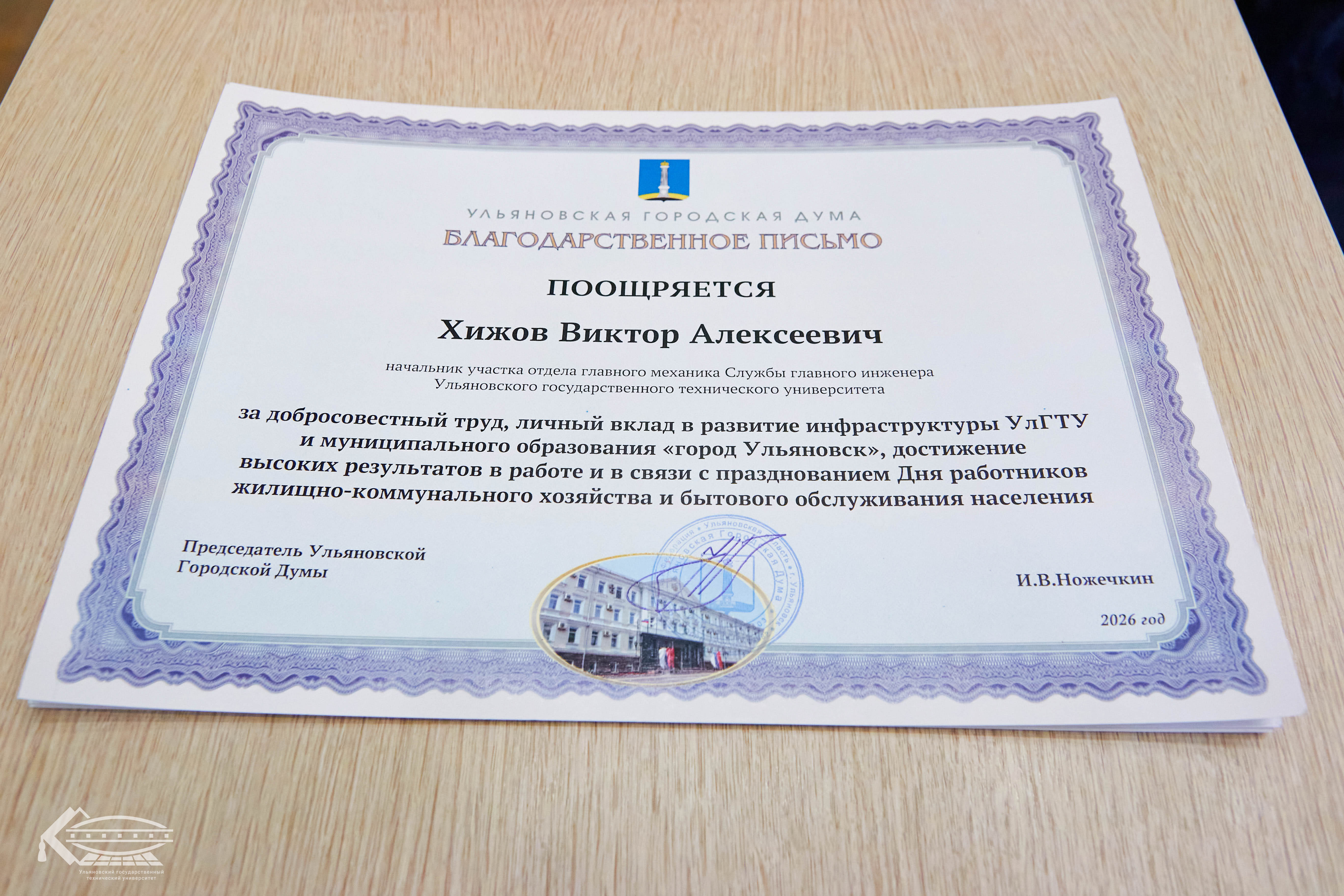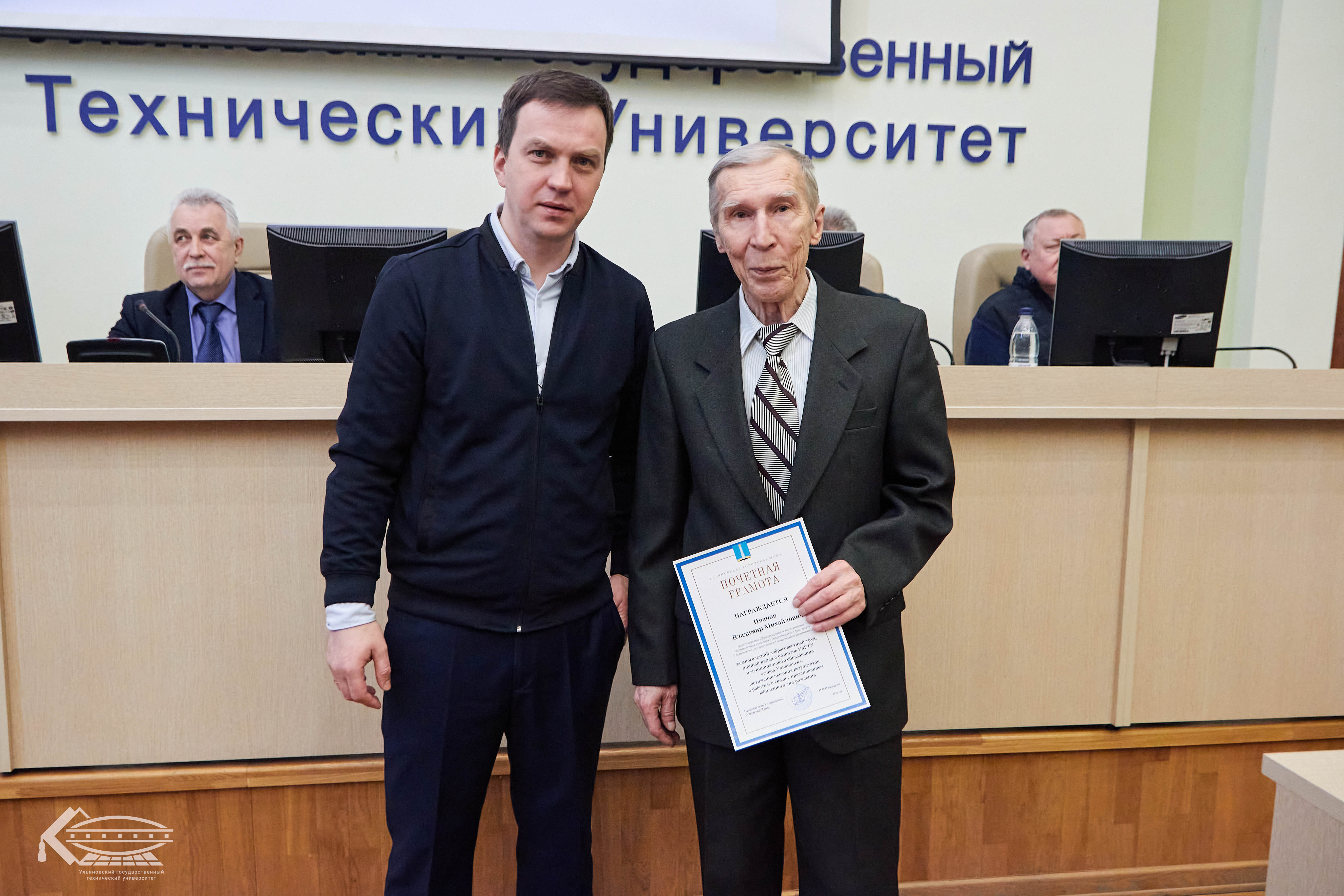 Почётной грамотой Ульяновской Городской Думы за многолетний добросовестный труд, высокий профессионализм и значительный вклад в развитие образовательной системы города награждены: старший преподаватель кафедры «Физическое воспитание» Вадим Самборский в честь 65-летия, доцент кафедры «Электропривод и автоматизация промышленных установок» Владимир Иванов, которому исполнилось 80 лет, и начальник отдела ГО и ЧС службы комплексной безопасности Андрей Буровский, отметивший своё 60-летие.